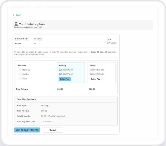 You can choose to subscribe to the Reading Module or your account will be paused. We’ll never charge you without your permission.